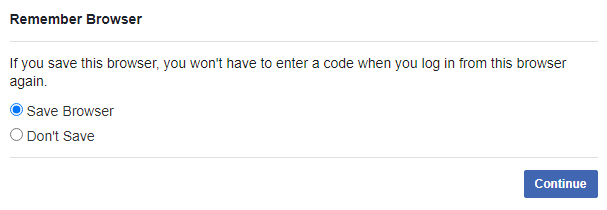 * If you select Save Browser, everytime you log into Facebook with the same browser on the computer, you will not be prompted for the 2FA but if you select Don't Save, you will need to enter your 2FA each time you log in.
