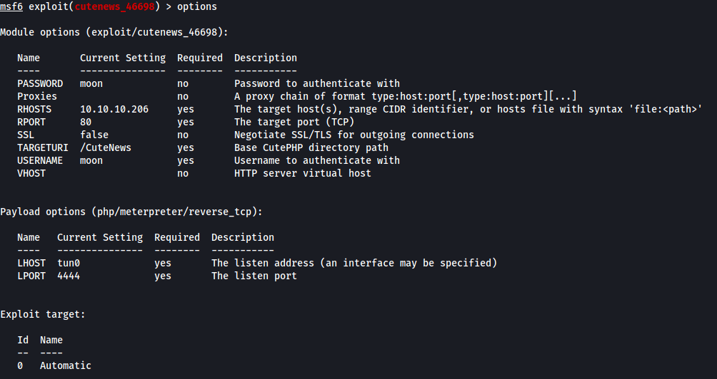 Set the rhosts, lhost (your tun0 ip address) and also set the username and password to what we registered as above.